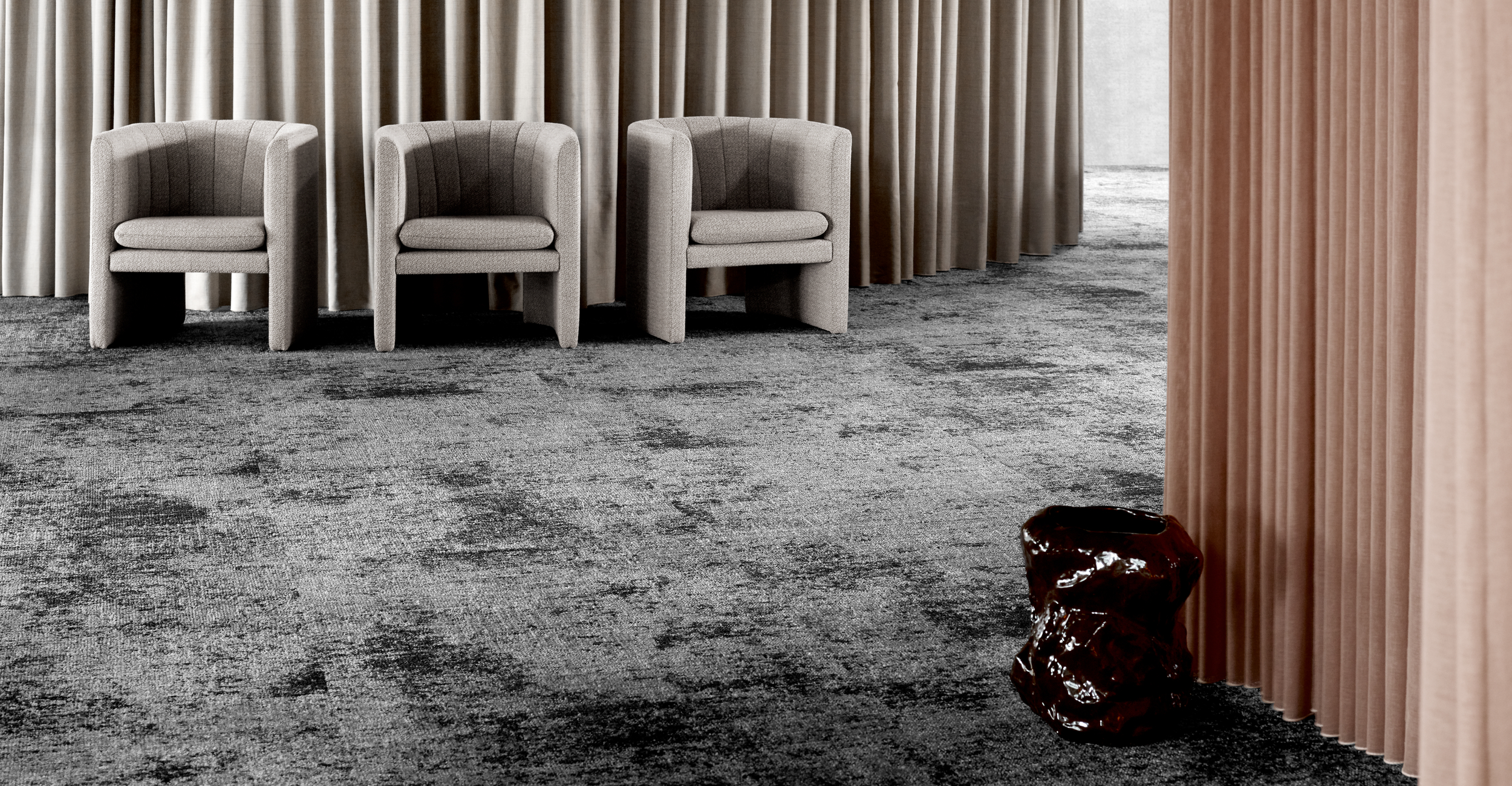Teppichfliese ReForm Construction Tiles ist an die mehrdimensionale Textur von Betonoberflächen angelehnt, die in der modernen Architektur gezielt eingesetzt werden. Die beiden Designs der Kollektion, Iron und Concrete, spiegeln die natürliche Optik, der im Laufe der Jahre veränderten und durch Patina verfeinerten Werkstoffe, wider. Jedes Design ist in 5 Farbgruppen erhältlich, die den hohen Detaillierungsgrad und die Finesse der Materialien optimal wiedergeben. Die 96x96 cm Mix-Fliese ist ein zusätzliches Designwerkzeug, mit dem sich auf dem Boden fließende Farbübergänge erzeugen lassen (Schau das Video).